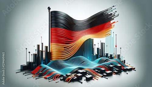 "Dynamic 3D illustration of the German flag waving over a modern city skyline with integrated data charts and graphs, representing economic strength and technological progress."