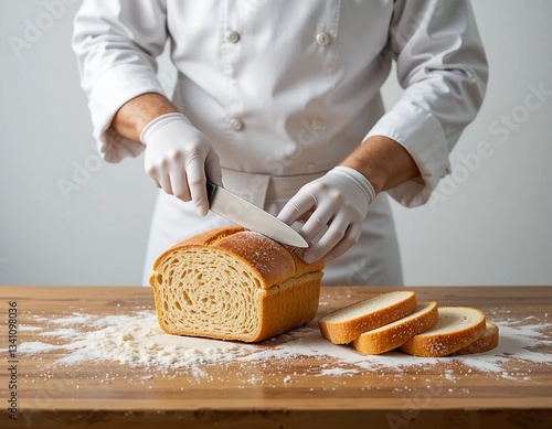 "Professional Chef Slicing Freshly Baked Bread – Clean and Hygienic Kitchen Setup"