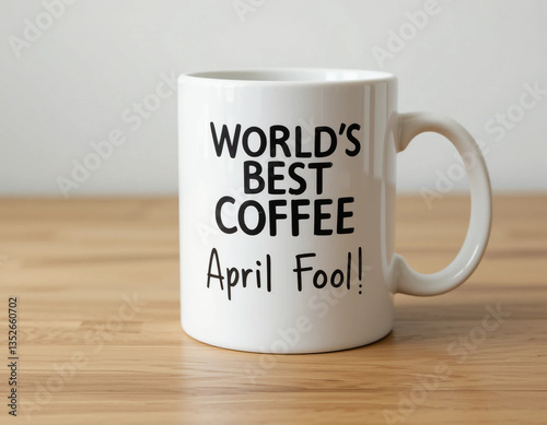 "April Fools' Day Coffee Mug with Funny Text on Wooden Table"