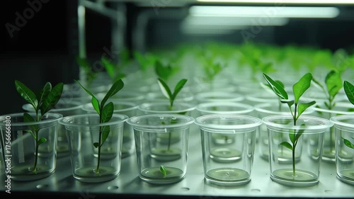 Vibrant Growth of Young Green Seedlings in Transparent Containers Under Bright Lights Showcasing Healthy Leaves and Indoor Agriculture Practices