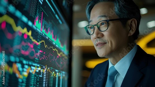 Businessman Suit Analyzes Financial Data Screen, Showcasing Focus and Determination Corporate Environment with Insightful Graphs and Statistics