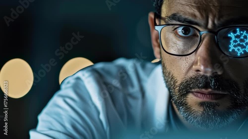 Male Scientist with Glasses Showcases Digital Virus Representation Laboratory, Symbolizing Innovation and Technology Futuristic Research Atmosphere