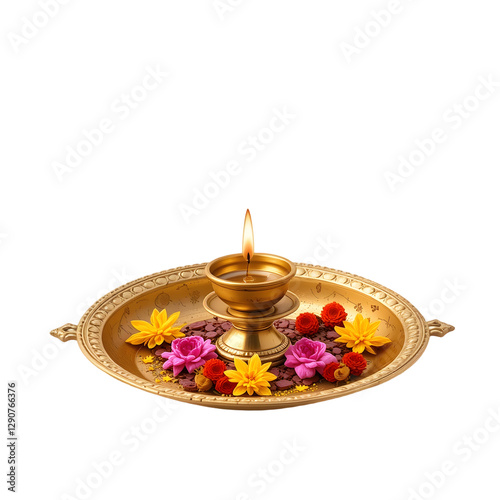 "Traditional Brass Diya with Burning Flame on Decorative Puja Thali Adorned with Vibrant Flowers – Indian Festive Oil Lamp for Diwali, Pooja, and Spiritual Celebrations"