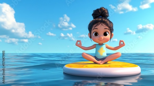 "3D Icon of Character Meditating Cross-Legged on Yellow and White Floatation Device in Calm Ocean Holding Circular Gesture Under Clear Sky with Scattered Clouds"