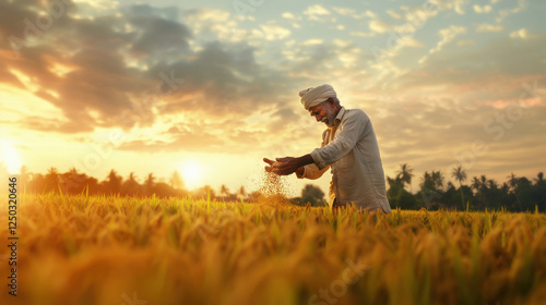 Indian farmer throwing fertilizer in the rice field.