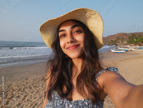 young indian woman taking selfie in mobile at beach