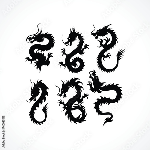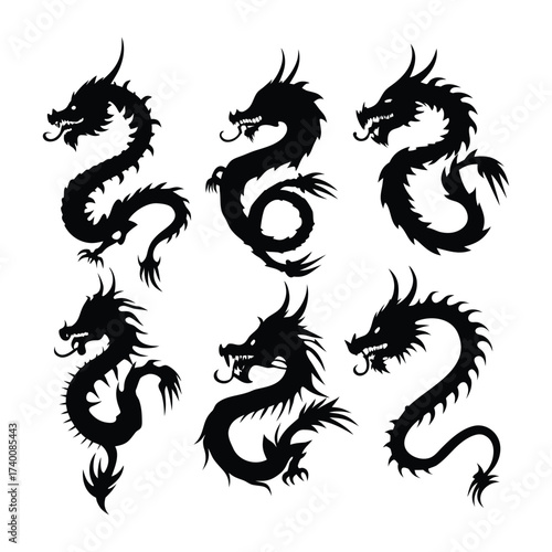 "Set of Oriental Dragon Silhouettes – Mythical Chinese Tattoo Designs"