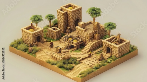 "Minimalistic 3D model of a gold mining operation in Africa, featuring stylized equipment, workers, and terrain in earthy tones.