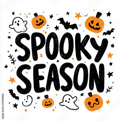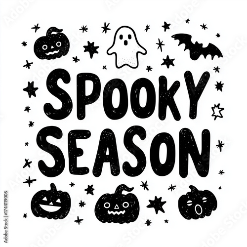 "Spooky Season" bold lettering with cute ghost characters floating around text, jack-o'-lanterns, bats, stars elements, playful hand-drawn style, isolated design, black and white illustration, t-shirt