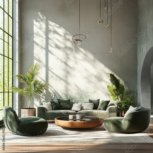 "A modern 3D-rendered mockup of a cozy living room featuring green decorative accents."