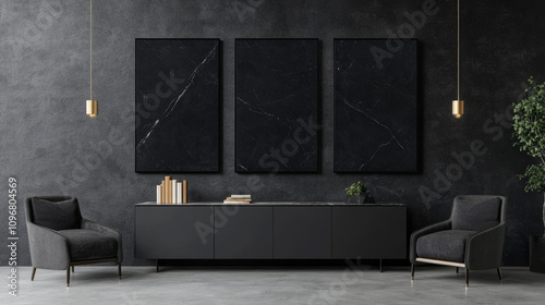 "Minimalist Black Living Room with Marble Sideboard, Home Library, and Canvas Poster Mockups - 3D Rendering"