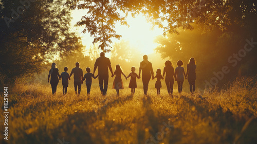 "Unity in Nature: A Large Family Walking Together at Sunset"