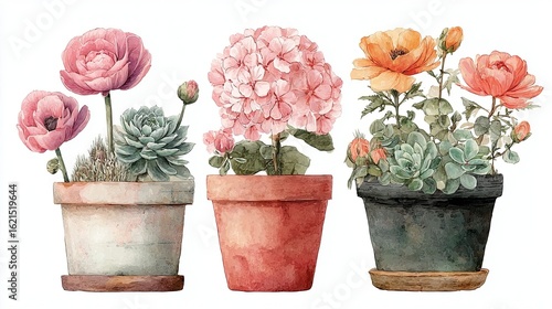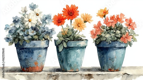 Vibrant Watercolor Floral Pots on Rustic Shelf