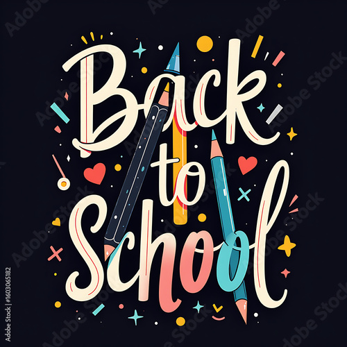 "Back to School" lettering design with pencils, hearts, stars, and confetti on a dark background.