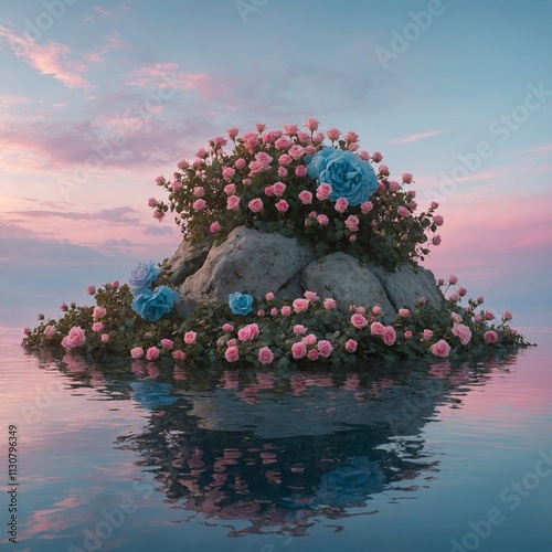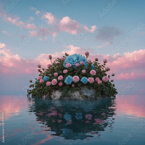 "A dreamlike floating island covered in blooming pink and blue roses against a pastel sky."