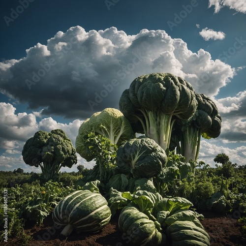 "A surreal scene of oversized vegetables growing on treetops, surrounded by floating clouds."