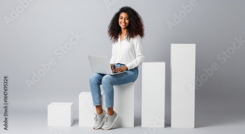 Woman with laptop sitting on white blocks resembling a bar graph against a gray background