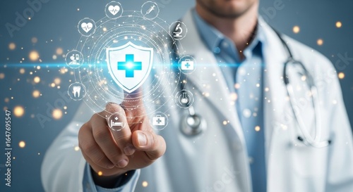 A doctor touching a digital health shield with various medical icons surrounding it in the air space