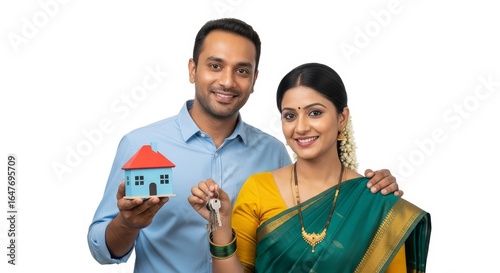 A smiling couple holding a miniature house and keys against a plain white background studio shot