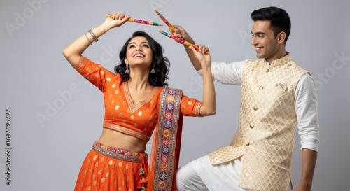 A smiling couple in traditional indian attire dancing with dandiya sticks against a plain background