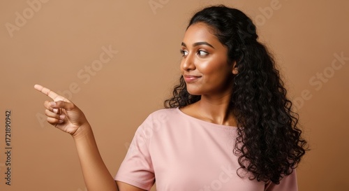 Woman with curly hair wearing a pink shirt pointing to the left on a brown background looking away