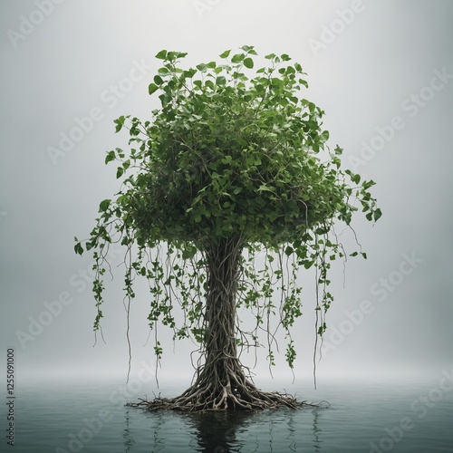 "A surreal floating green tree with roots hanging in the air over a white void."