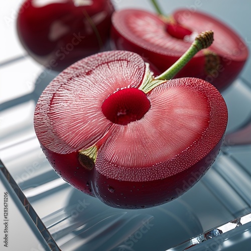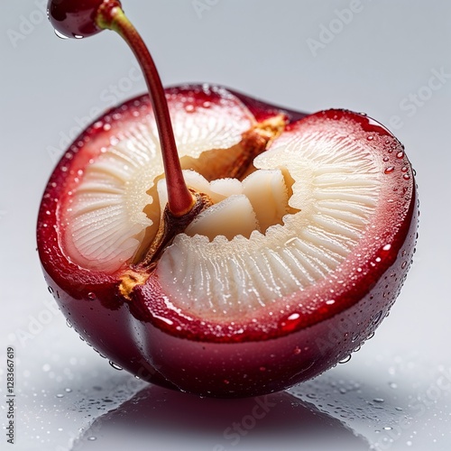 "The Sensual Elegance of a Crimson Cherry: A Close-Up Portrait of Nature’s Sweetest Jewel, Glimmering with Dewdrops on Silken Waves of Light, Capturing the Essence of Temptation, Freshness