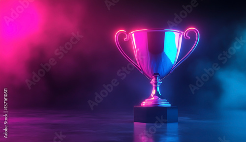 "3D neon illuminated winner's trophy cup with holographic effect on dark background"