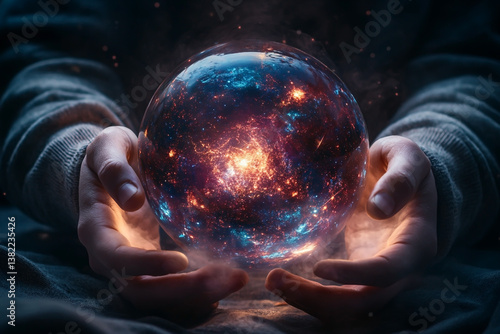 "A person holds a luminous crystal ball, inside which the universe shines against a dark blurred background"