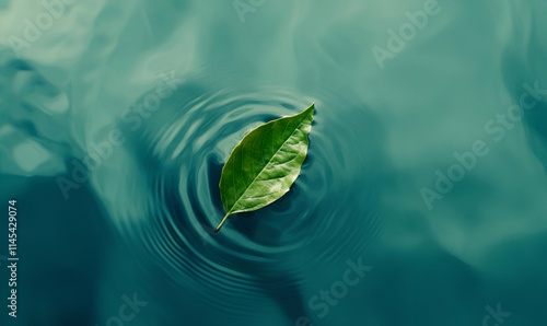 A single green leaf floating on calm water, creating ripples in a serene environment.