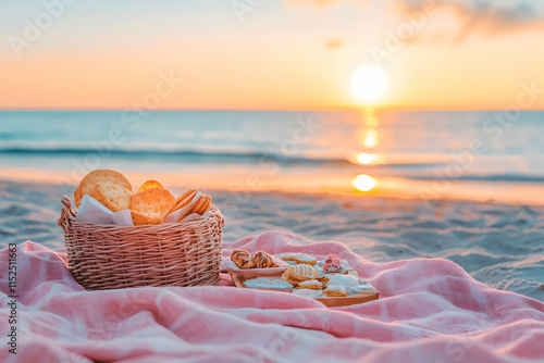 A serene beach picnic at sunset with a basket of treats and a beautiful view.