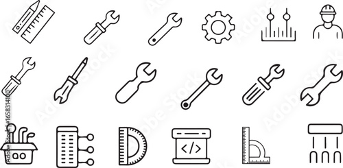 "Engineering and Tools Line Icon Set – Wrench, Screwdriver, Gear, Ruler, and Technical Symbols"
