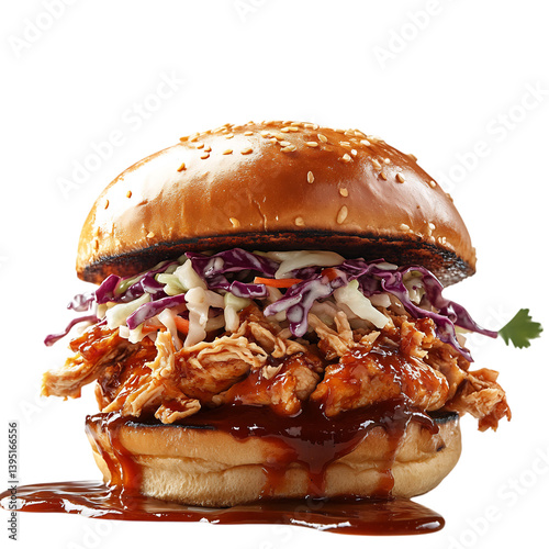 A Juicy Pulled Chicken Sandwich with Coleslaw and BBQ Isolated on Transparent Background