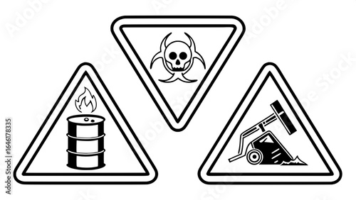 "Vector illustration set of industrial hazard icons — black-and-white pictograms for toxic gas, gas leaks, fire, corrosive chemicals — clean, minimalist line style."