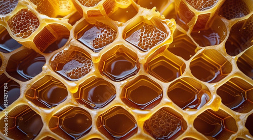 "Golden honey glistening in natural honeycomb cells, showcasing the hexagonal structure and rich amber liquid; detailed macro of fresh, pure honey."