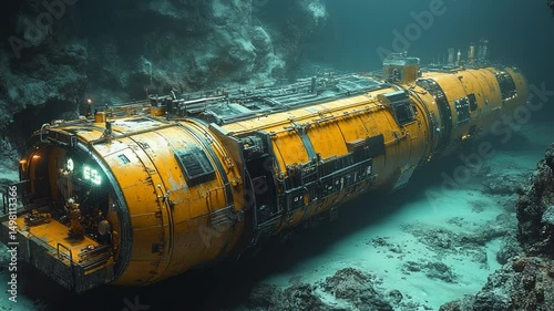 A yellow submarine exploring an underwater cave, surrounded by mysterious rock formations