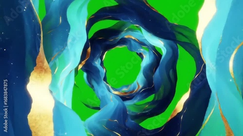 Abstract flowing blue & turquoise elements with gold accents over a solid green background, forming a central eye shape