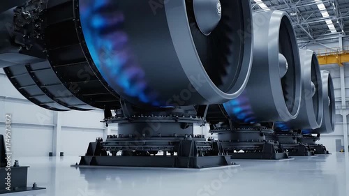 Row of Advanced Jet Engines on a Modern Factory Assembly Line.