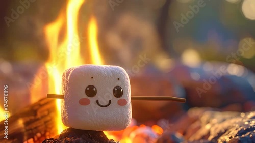 Adorable Kawaii Marshmallow Character Roasting Over a Campfire.
