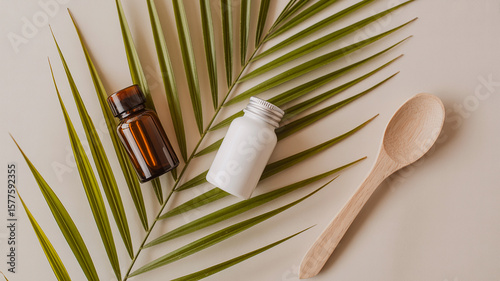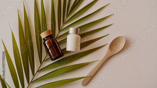 Natural Skincare Products Displayed on a Palm Leaf