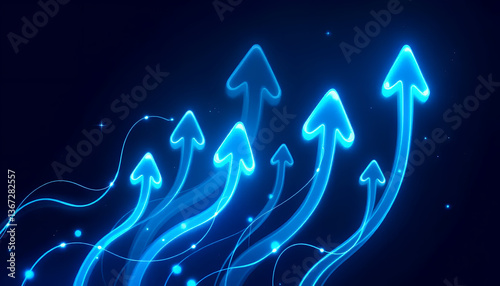 Abstract glowing arrows in neon blue, moving upwards against a dark background, representing success, innovation, and futuristic business growth.