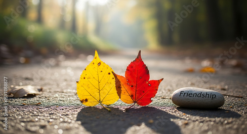 "Side by Side: A Peaceful Friendship Day Scene with Fallen Leaves and Nature’s Quiet Bond"