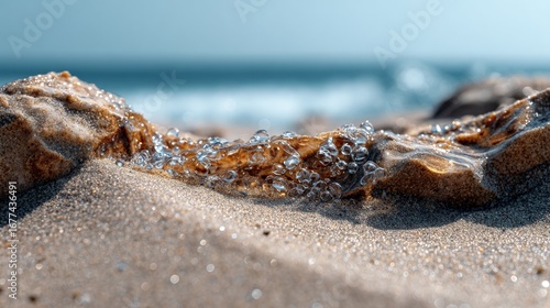 Close-up view of icy blocks, showcasing intricate patterns and shades of translucent blue, set against a backdrop of snow and distant mountains.