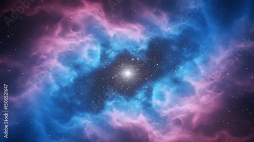 Vibrant cosmic nebula with swirling pink and blue gases, showcasing stars and celestial beauty