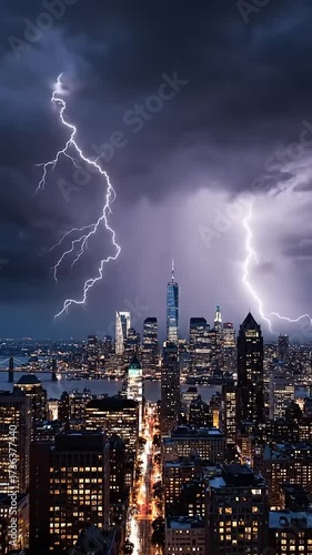 Dramatic lightning illuminating a city skyline at dusk with dark storm clouds overhead