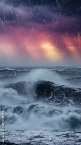 Dramatic seascape showcasing turbulent waves crashing against dark rocks under a colorful sky