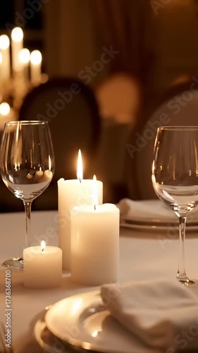 Elegant dinner setting with candles and wine glasses, creating a romantic atmosphere in a restaurant