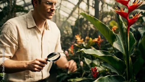 Botanist Examining Plant Leaves with Magnifying Glass in Lush Greenhouse.
