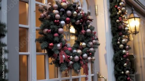 Beautiful Christmas Wreath Adorns a Doorway with Festive Ornaments and Garlands.