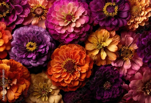 Vibrant zinnia blooms in a spectrum of oranges, pinks, and purples